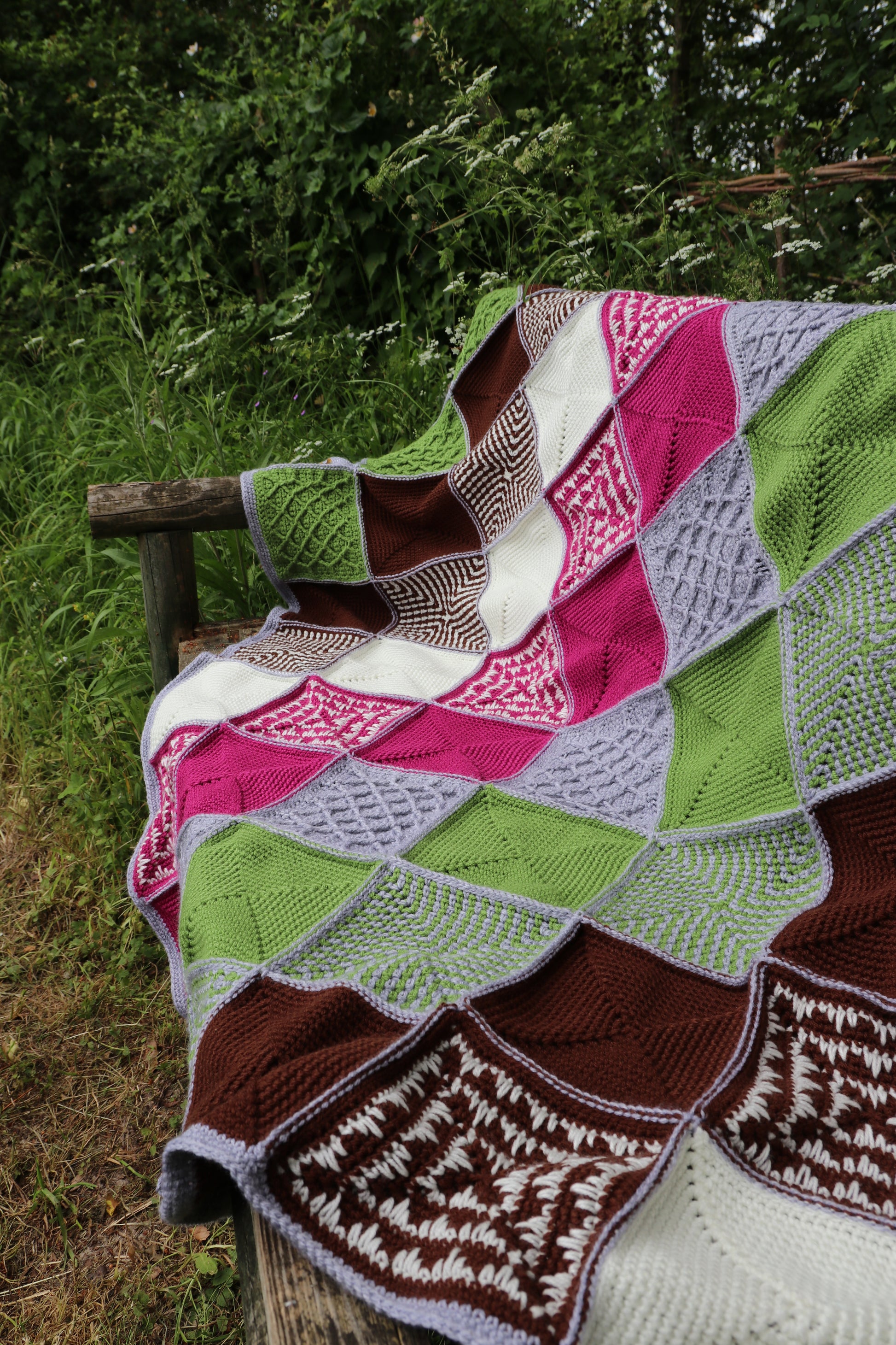 Bolderwood is named after the beautiful forest which is also a deer sanctuary in New Forest. This is made out of four types of squares which are then joined together to form a large blanket. You are in complete control of how large you would like the blanket to be. I have laid them out diagonally in a style of traditional patchwork quilt; starting from the corner you have rows of textured squares, followed by rows of plain squares, each row uses one or two colours. All the squares are joined using flat slip stitch joint, then the edging is crocheted on. I have loved making this blanket as you can’t beat the portability of a crochet square, you can take them anywhere.