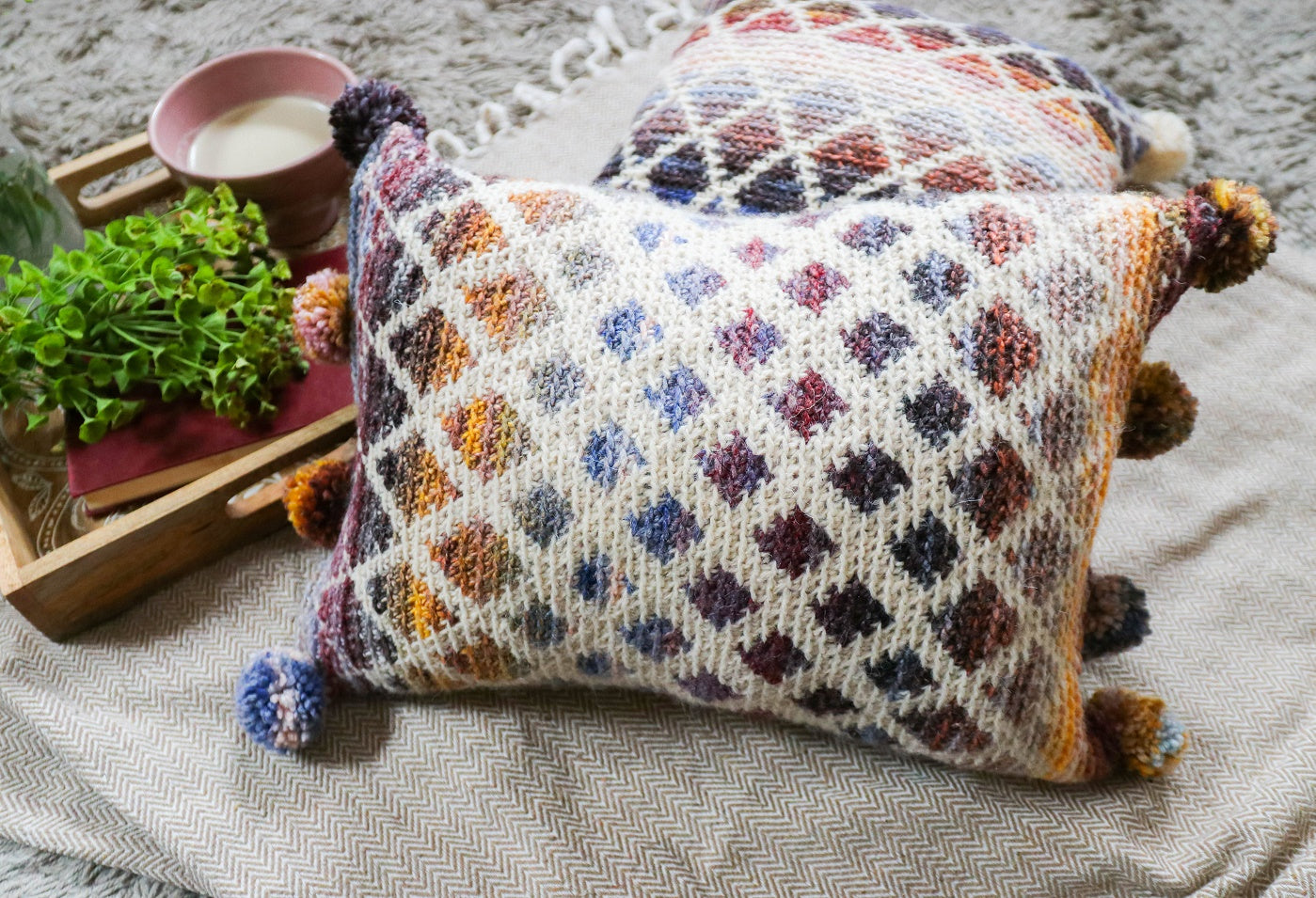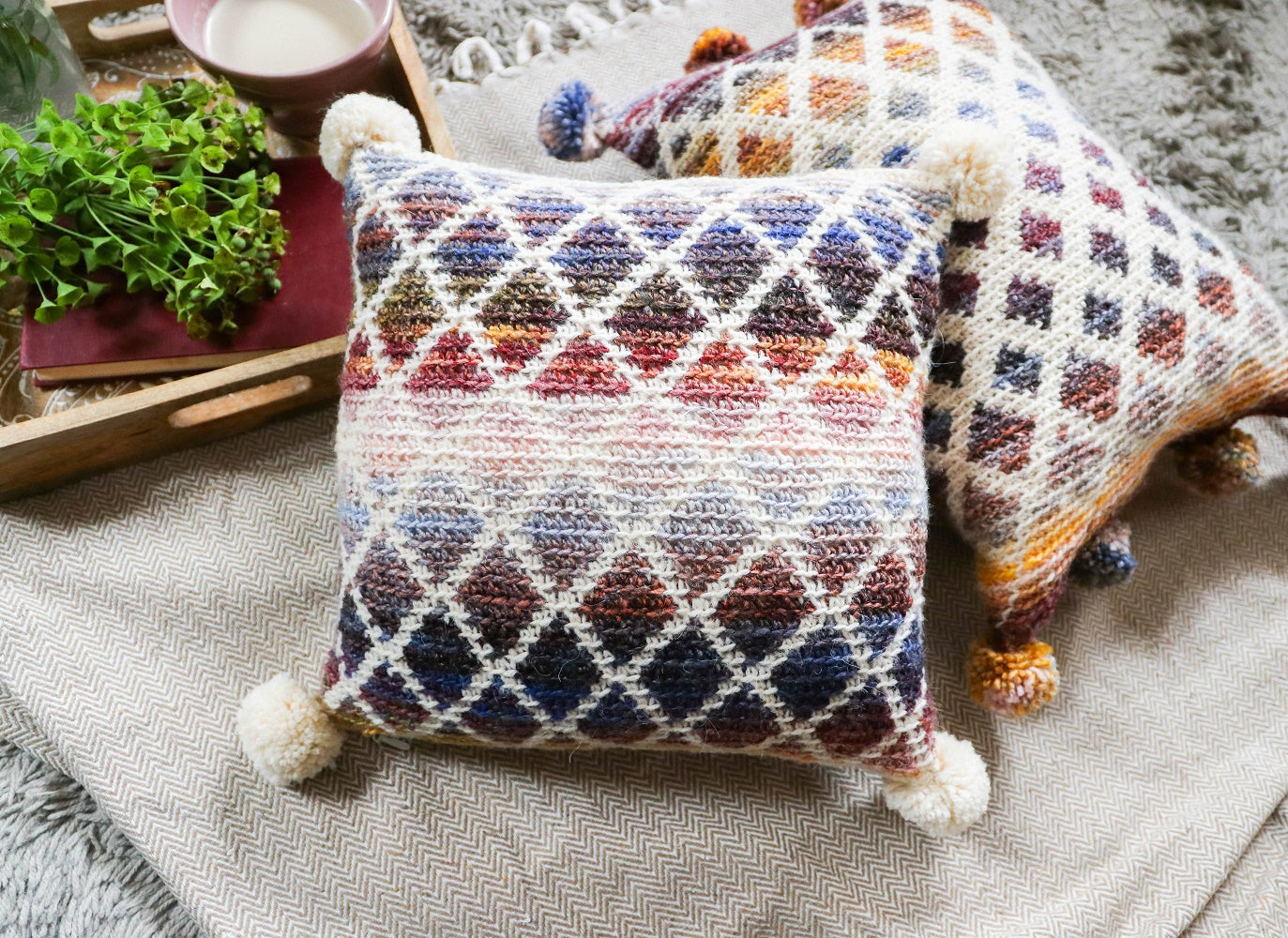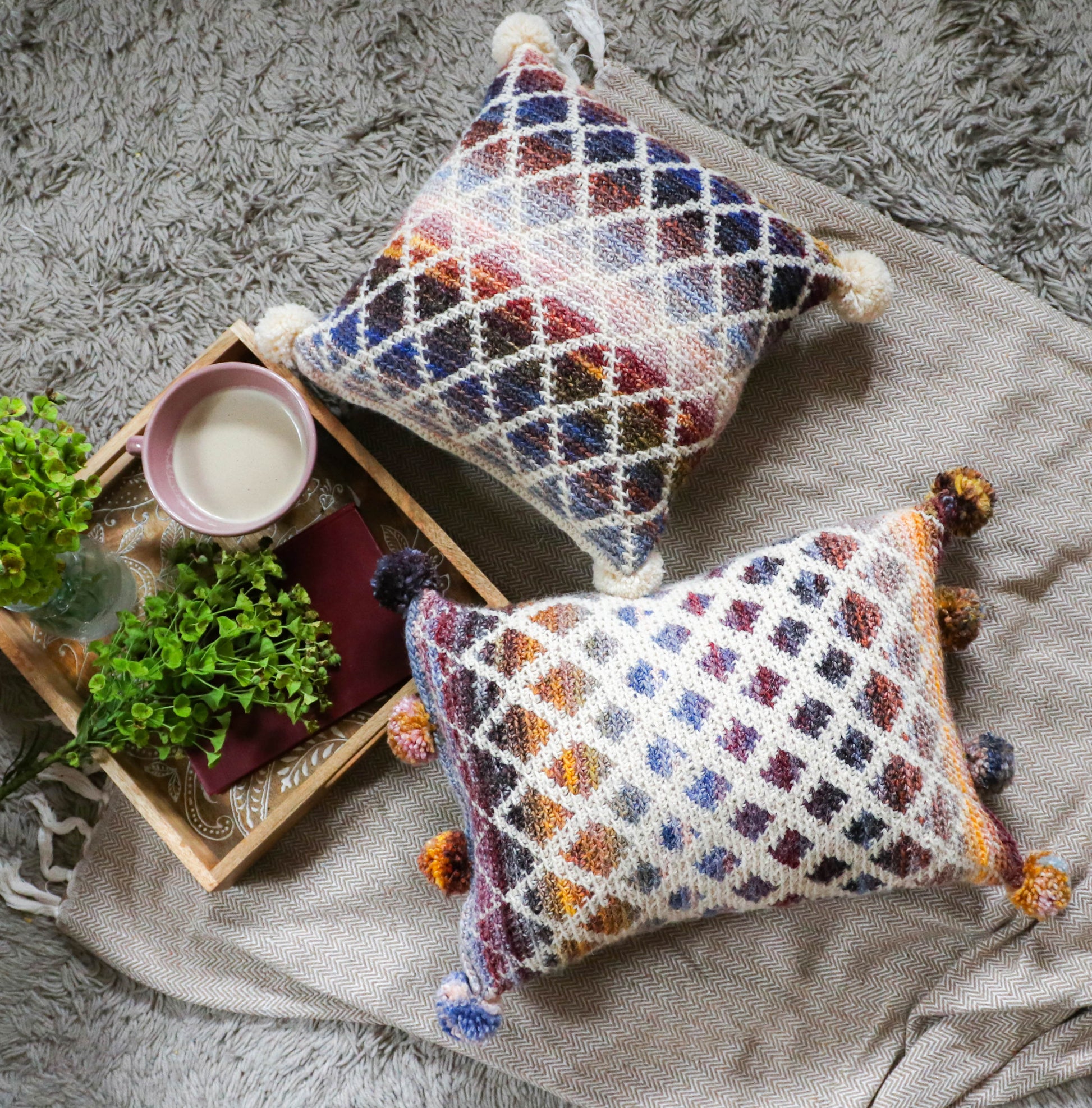 Set of two cushions covers worked using the wonderful Tapestry crochet technique which allows you to work using two colours producing a stunning effect. The beauty of Sirdar Jewelspun really shines through on the background of solid colour.