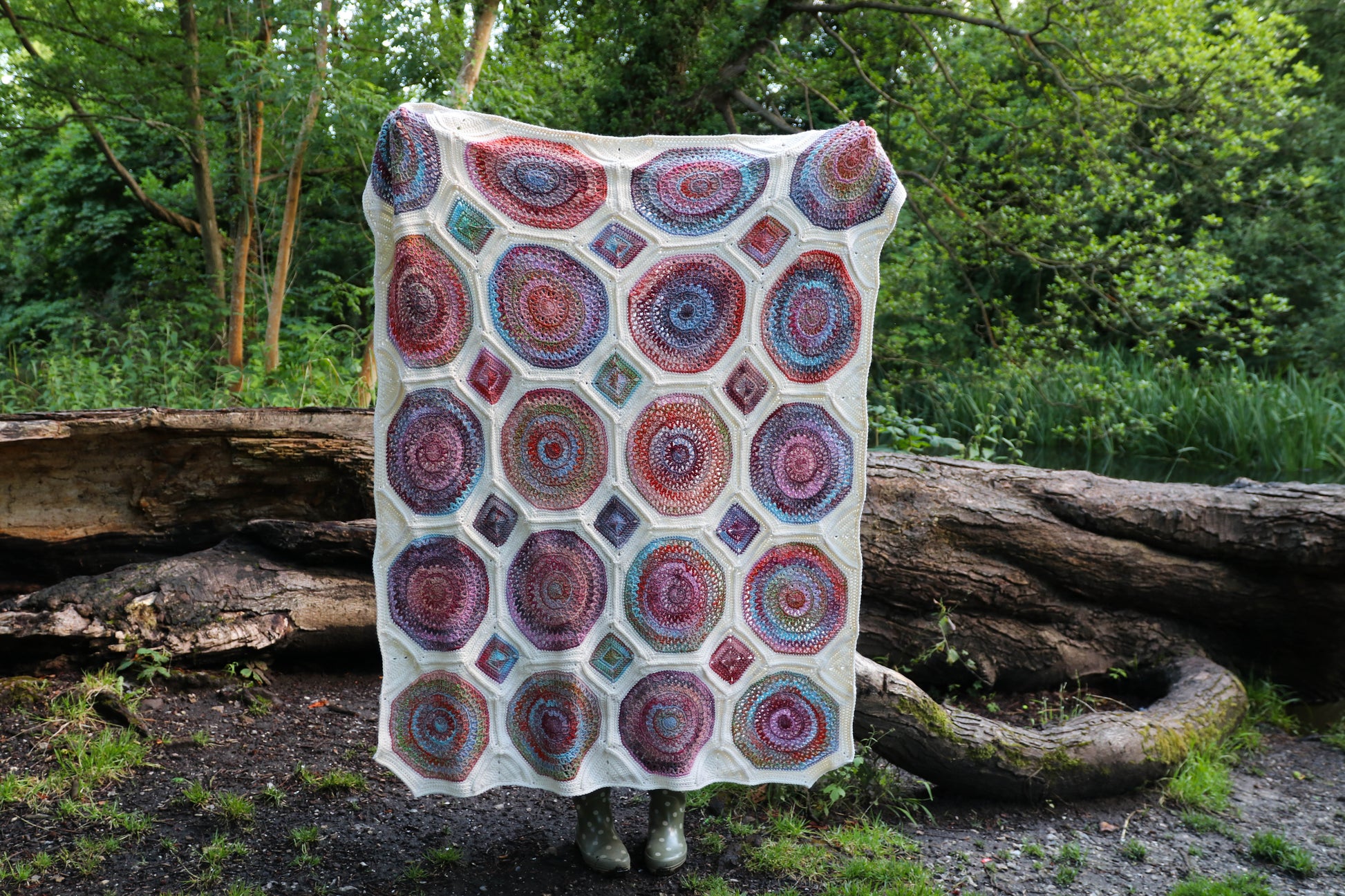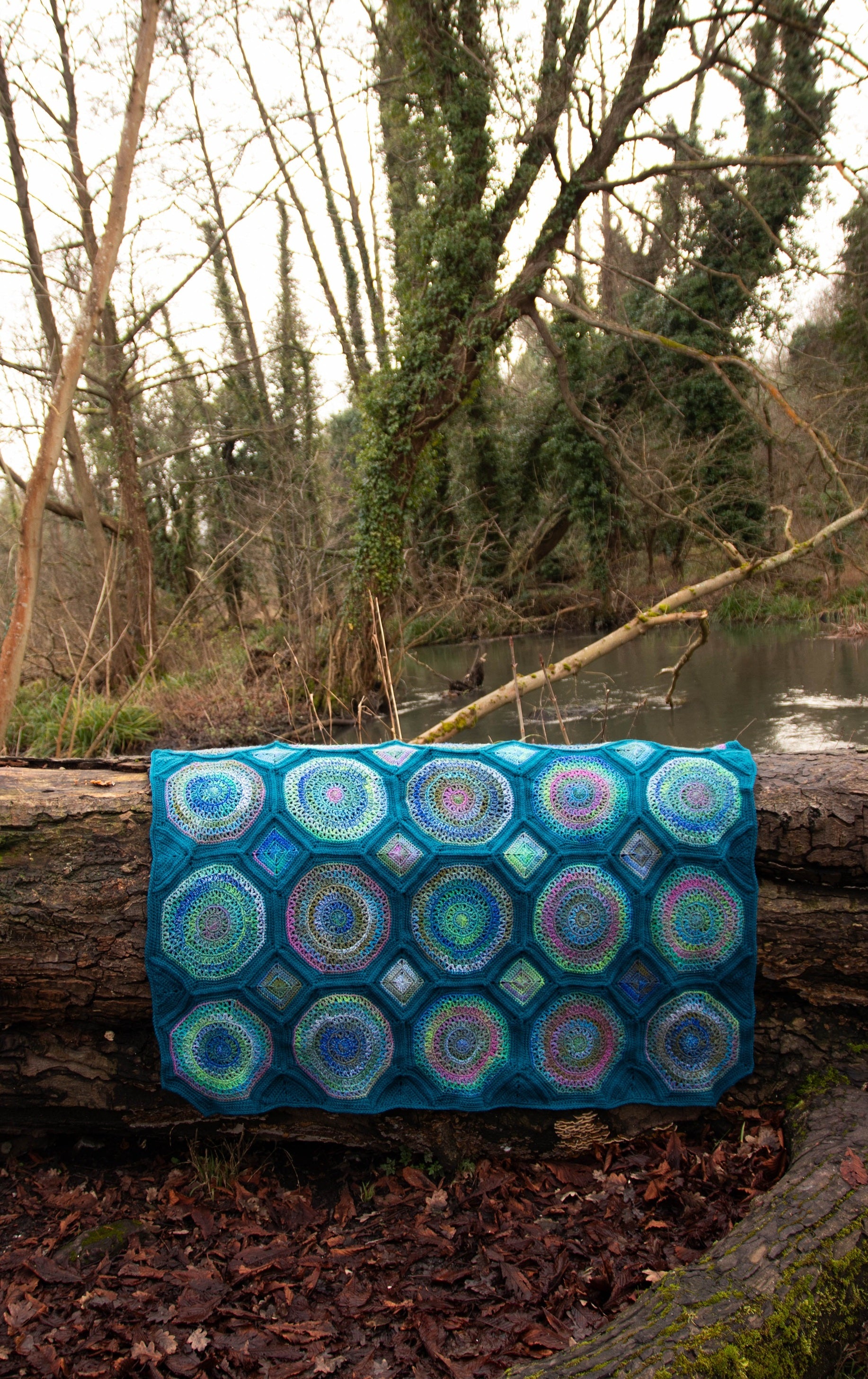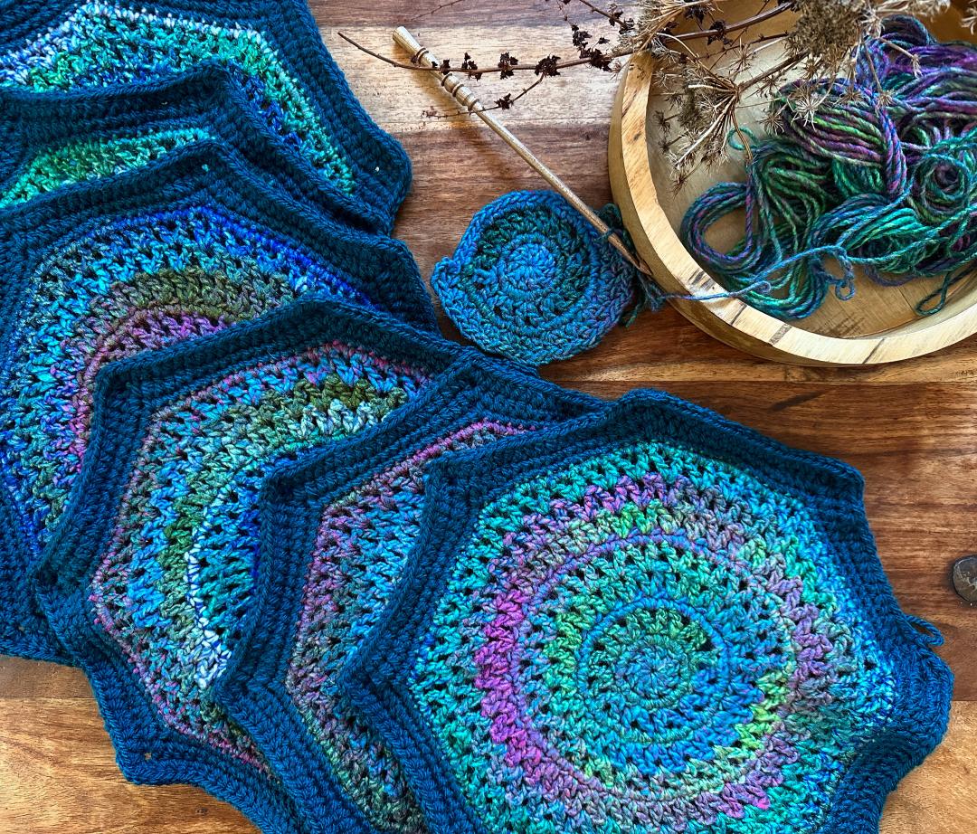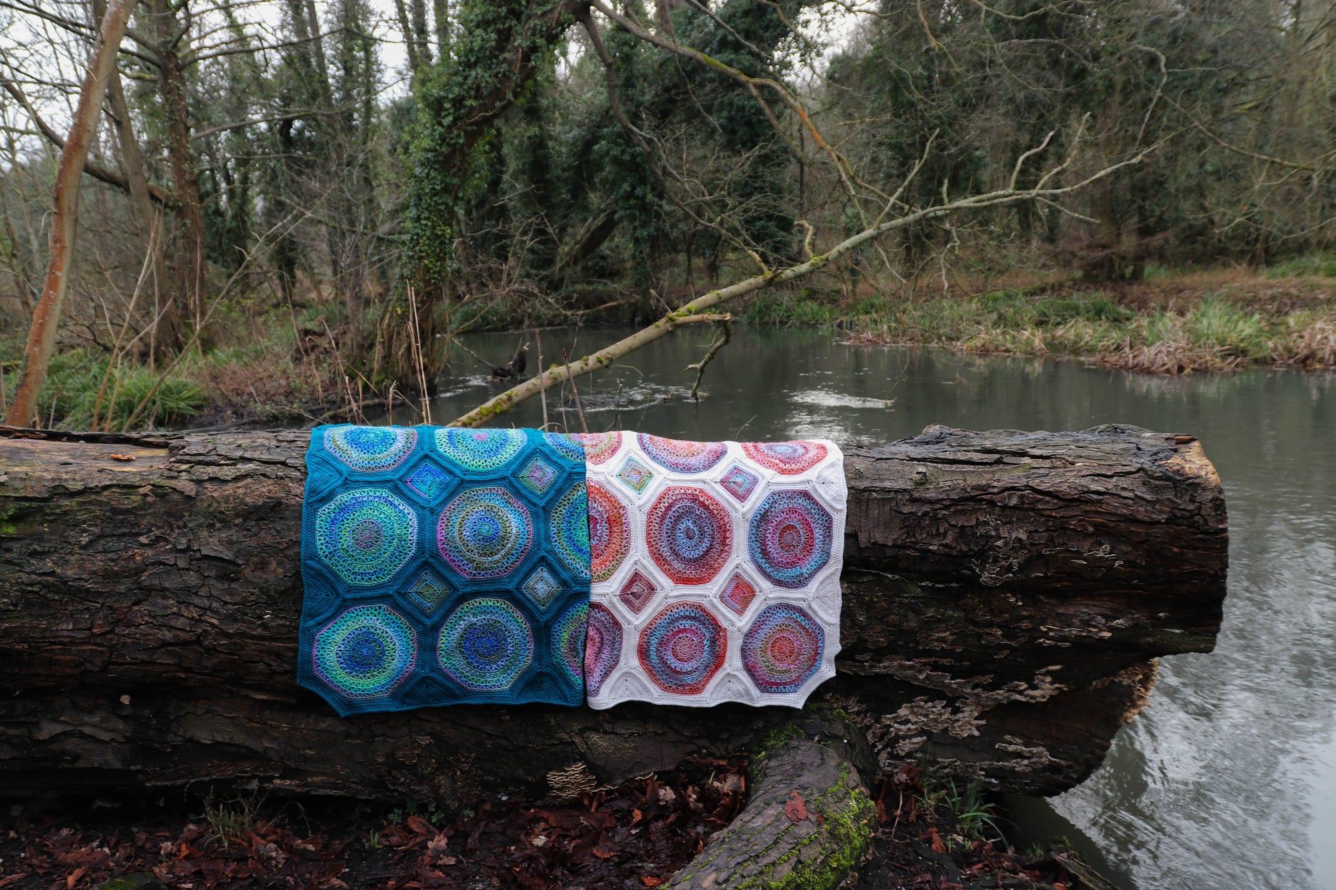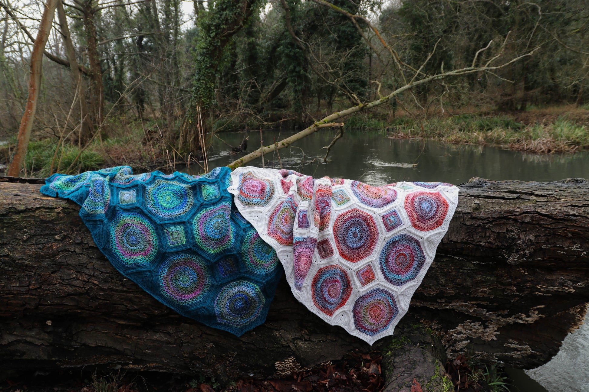 The centres of the beautiful motifs are crocheted with Sirdar Jewelspun creating the stunning colour effects. The outlines are crocheted in calming solid colour.