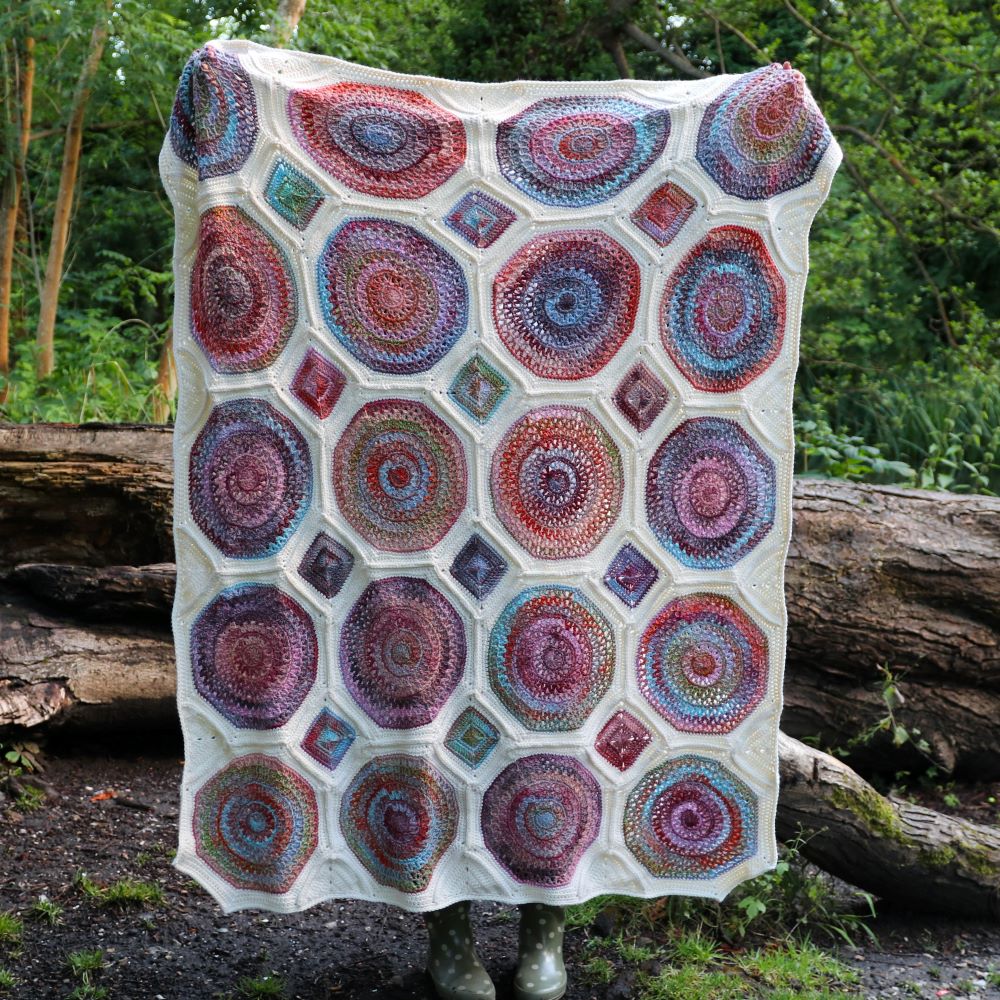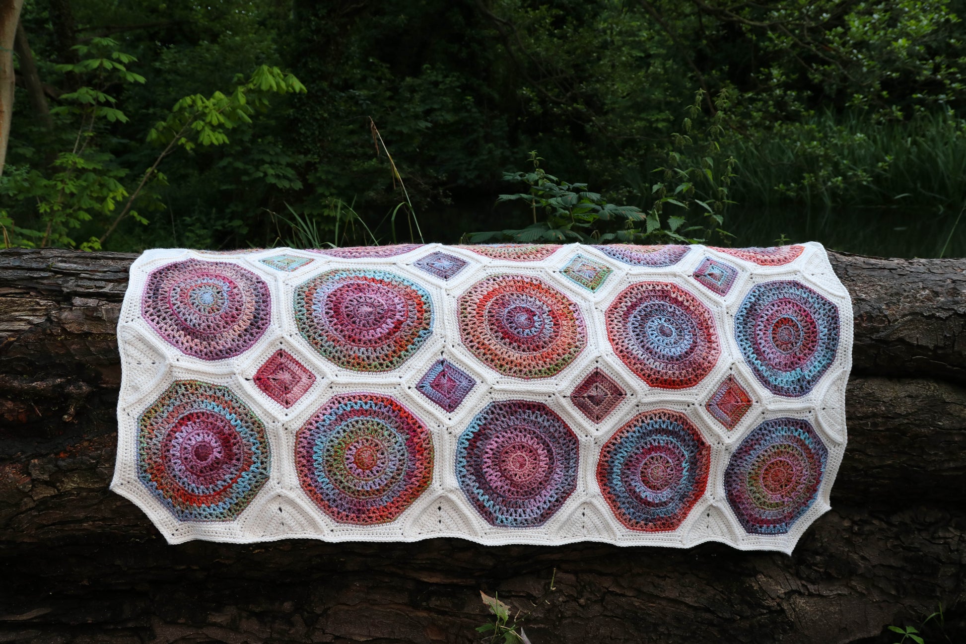 The centres of the beautiful motifs are crocheted with Sirdar Jewelspun creating the stunning colour effects. The outlines are crocheted in calming solid colour.