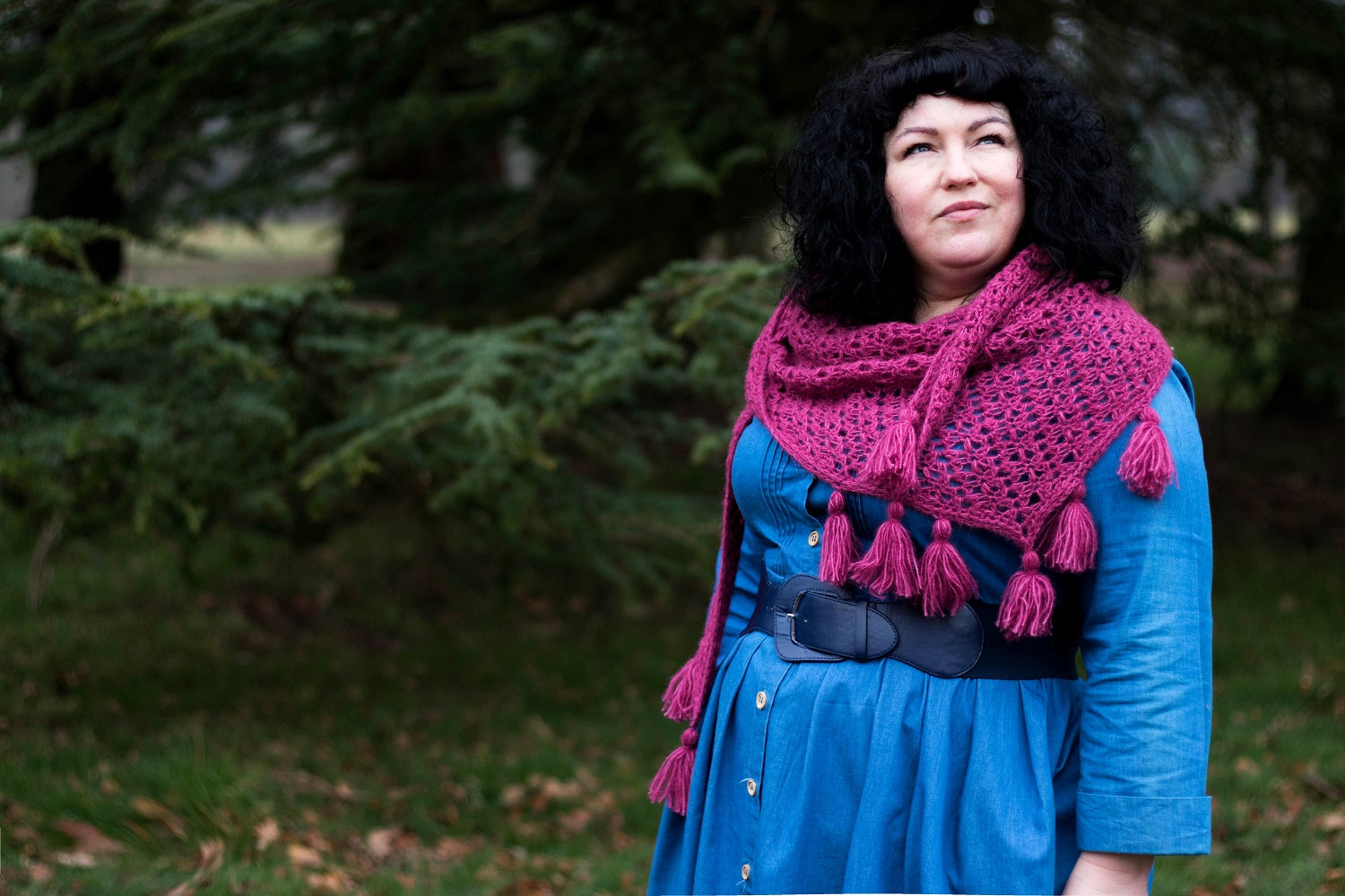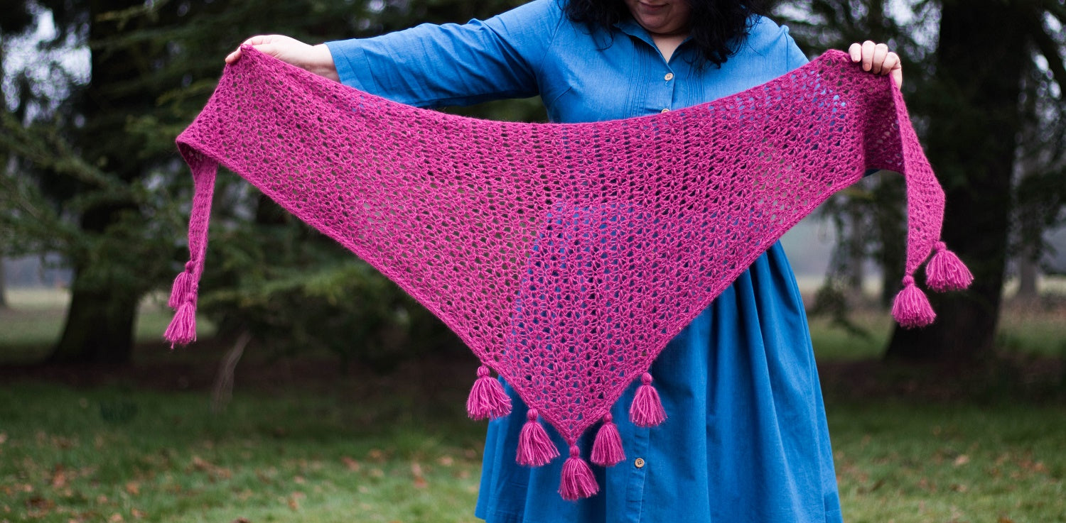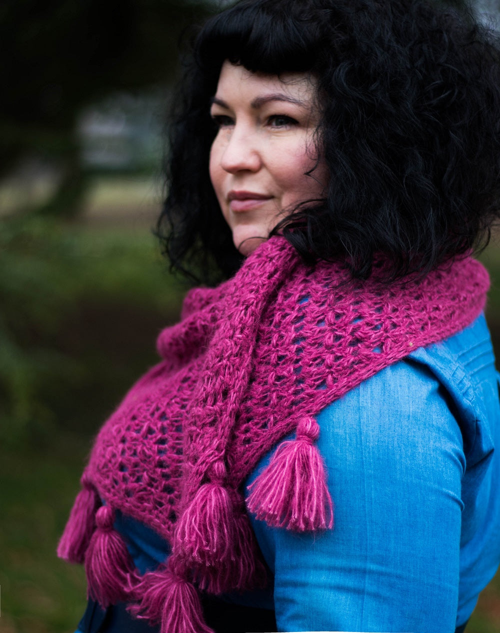 Edging is worked around two sides and the shawl is finished off with playful tassels.
